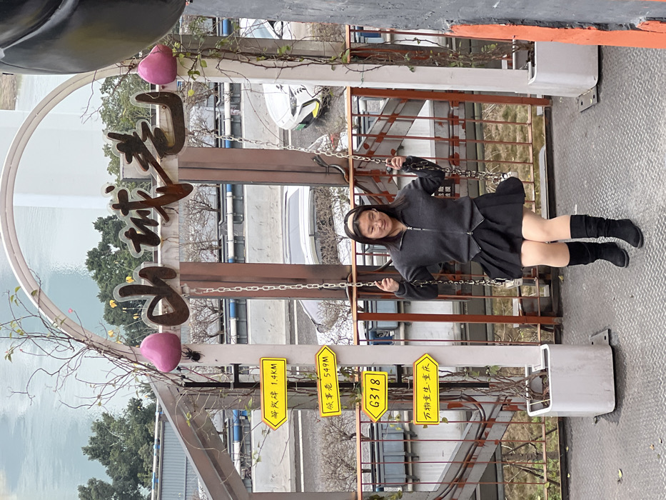 A girl in a gray jacket, black skirt, and knee-high boots sits on a swing in an outdoor setting. The swing is suspended from a metal structure with decorative signage. The background includes a view of water and greenery. Several yellow direction signs are attached to the structure. The girl smiles slightly and appears relaxed on the swing.