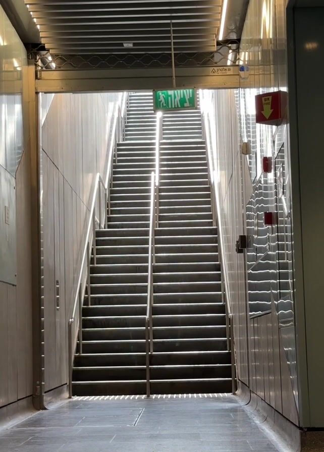 A man in a black jacket with a white triangular logo walks towards a long staircase. The staircase leads to a brightly lit opening, possibly outside. The area surrounding the staircase is a tunnel-like space with shiny, metallic walls and a gray floor. The lighting is provided by long fluorescent lights overhead. Exit signs in both English and Hebrew are visible. The man appears to be heading up the stairs.