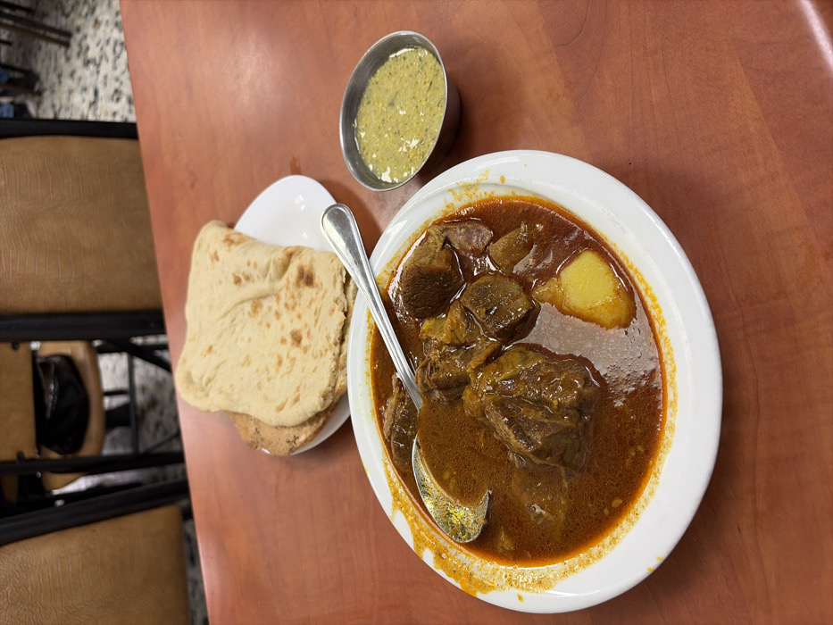The image displays an indoor restaurant setting in Tel Aviv, Israel, featuring a meal on a reddish-brown wooden table. In the foreground, a large white oval plate contains a dark reddish-brown stew with numerous irregular chunks of dark meat and two visible pieces of yellow potato. A silver metal spoon rests in the stew. To the right of the main plate, a small, round, metallic bowl holds a greenish-yellow condiment with discernible specks of herbs. Behind the stew, a stack of two light-brown flatbreads is presented on a smaller white plate. The background, out of focus, reveals two light-brown upholstered chairs with dark frames, one partially obscured by the other. A dark bag is visible on the seat of the chair further back. A section of a light-colored, possibly patterned or tiled, floor is also visible. No individuals are present in the frame.