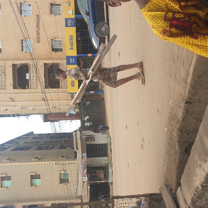 A street scene in Onitsha, Nigeria, shows an unpaved, reddish-brown dirt road under an overcast sky. In the mid-ground, a person, possibly young, walks from left to right, wearing a patterned dress and flip-flops. They carry approximately five to seven long, light-colored wooden planks horizontally across their body. To the immediate lower right, the top of a head and shoulder of another individual wearing a yellow patterned garment are partially visible. In the left background, several single-story shops with corrugated metal roofs are visible, with a multi-story residential building behind them. One person is seated on a low structure near these shops. In the right background, a prominent multi-story concrete building features multiple balconies and windows. The words "GOD OF ABRAHAM" are inscribed on one of its upper facades. Its ground floor displays commercial signage, including a large yellow and blue "WELL [partial text] BETKING" sign and a "POS" sign. A dark blue sedan is partially visible on the road, positioned between the walking individual and the right-side building. Overhead utility wires crisscross between the buildings. An open concrete drainage ditch runs along the lower left foreground.
