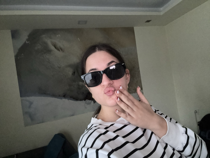 A female subject, appearing to be a young adult, is depicted in a medium close-up, self-portrait style photograph taken indoors. She wears dark rectangular sunglasses and a white long-sleeved shirt with horizontal black stripes. Her dark hair is pulled back. She is captured with her lips pursed in a pouting gesture. Her right hand (viewer's left) is raised, with fingers lightly touching her chin or lower face, revealing nails manicured with white polish and red tips. A gold hoop earring is visible on her left ear (viewer's right). In the background, a large, rectangular piece of wall art, depicting an abstract or natural snowy/cloud-like landscape in shades of white and grey, is mounted on a light-colored wall. The ceiling is light-colored and features a rectangular recessed area or fixture towards the top right. A dark-colored, upholstered furniture item, possibly a sofa or chair, is partially visible in the lower left background. No specific features are present within the image to definitively determine a precise location within the city of Tbilisi, Georgia; the setting appears to be a generic interior room.