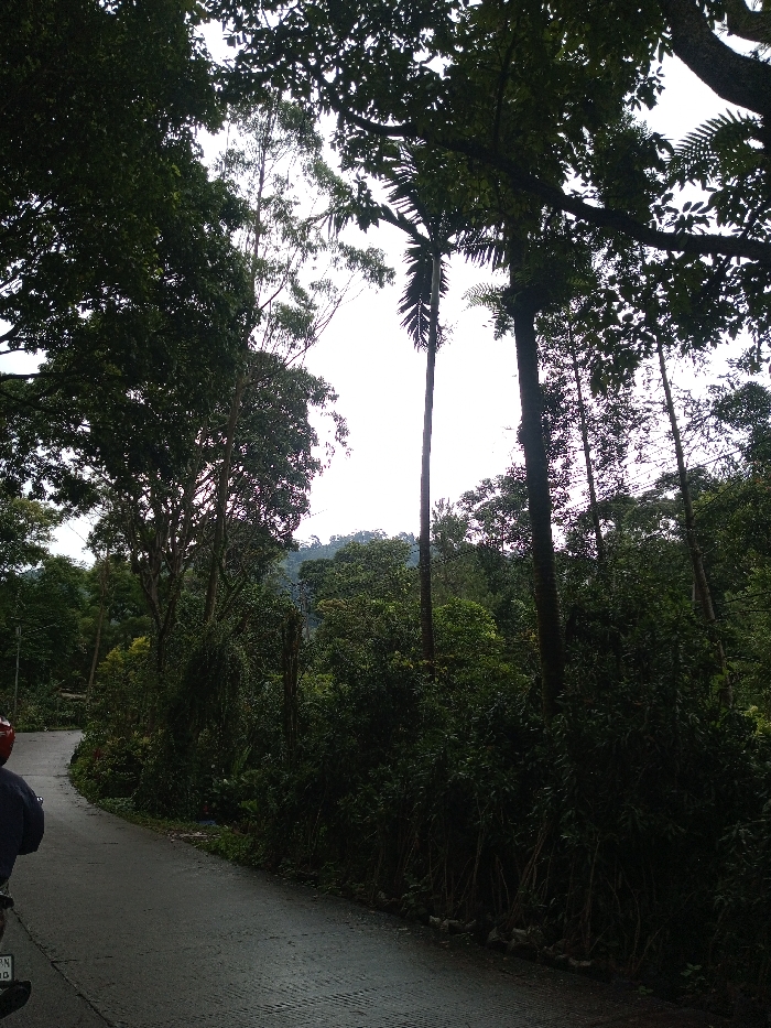 The image depicts a winding paved road through a densely vegetated, natural environment in Ambakirano, Madagascar, under an overcast sky. In the lower-left foreground, the left shoulder and back of an individual wearing a red helmet and a dark blue jacket are visible, seated on what appears to be a motorcycle; a portion of the vehicle's rear fender and a license plate ending in "D" are discernible. The road surface is dark and appears damp or shaded, curving leftward and slightly uphill out of frame. The right side of the road is bordered by a thick mass of dark green foliage, including numerous bushes and trees of varying heights, some with slender, tall trunks suggesting palm trees, reaching towards the bright white sky. The background features more hills covered in lush, dark green forest, contributing to an overall impression of abundant tropical or subtropical vegetation. No direct interactions between people are visible.