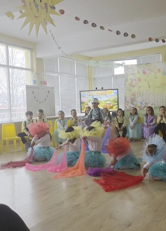 In a brightly lit classroom with decor suggestive of a spring celebration, a group of children is gathered for a performance