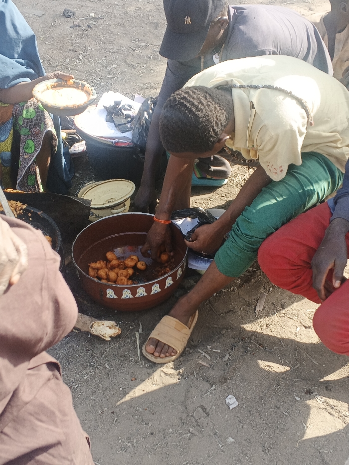 - "The image portrays an outdoor scene in Gobirawa, Nigeria, featuring multiple individuals gathered around food items on unpaved dirt ground under bright sunlight" by FM-goA943, licensed under CC BY 4.0