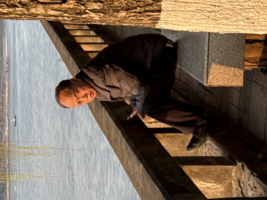 An adult male is seated on a speckled stone bench beside a riverbank in Jiangjin, China