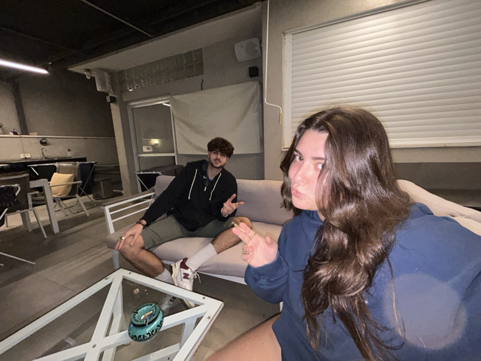 Two people are photographed in an outdoor setting. A woman with long, wavy dark hair is in the foreground, making a peace sign. Behind her, a man sits on a light gray couch with his legs crossed and also making a peace sign. A glass-topped coffee table is in front of them, with an ashtray on it. The background shows a wall with a large closed shutter, an outdoor cooking area, and patio furniture. The overall scene suggests a relaxed and casual atmosphere.