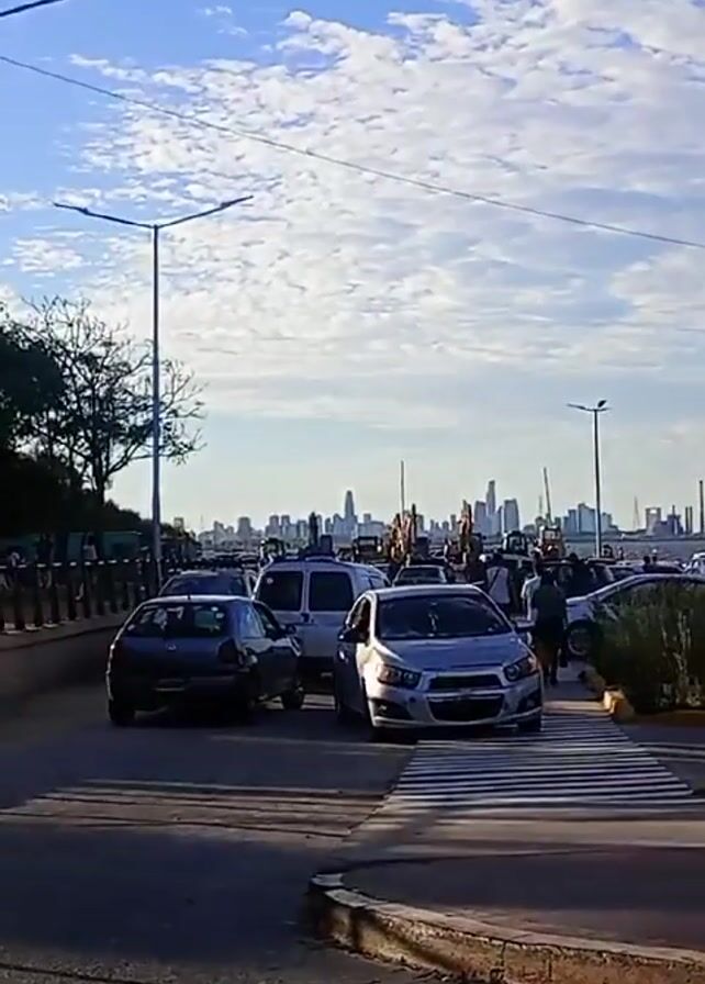 The video captures a scene by the waterfront, with a backdrop of a distant city skyline. There's a congested road with several cars including a red hatchback vehicle visible in the foreground. People are walking on the crosswalk and sidewalk near the road. Street lamps line the road. The sky is bright blue with scattered clouds. The sun is very bright in one portion of the video.