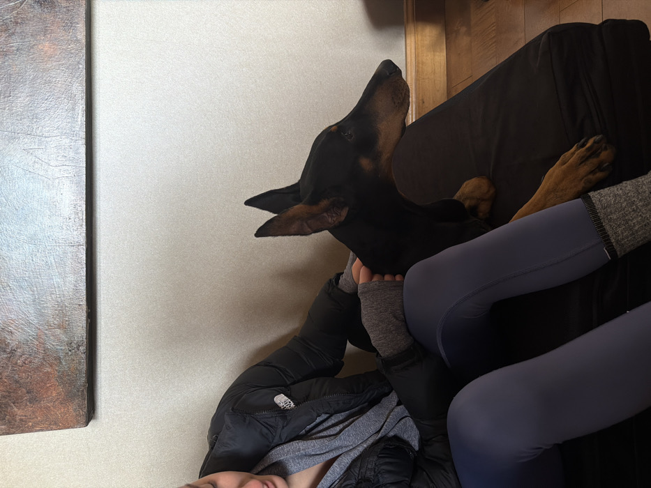 A Doberman Pinscher lies on a black sofa with a person wearing grey leggings and a black puffer jacket. The dog's head is angled upward towards the viewer, while the rest of its body rests on the sofa. The person is mostly out of view, and only a part of their face is visible. A painting hangs on the wall.