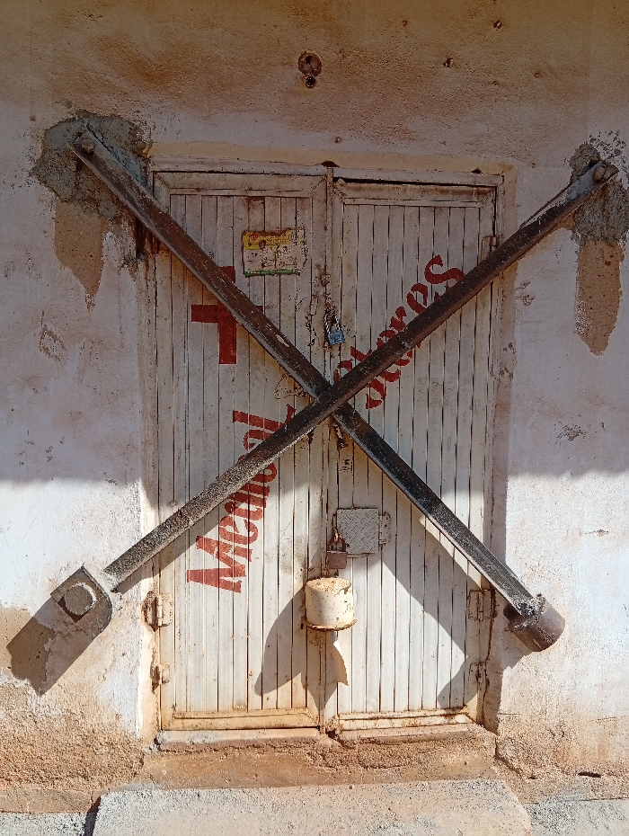 An exterior view in Jos, Nigeria, captures a pair of weathered, off-white vertically paneled metal doors recessed into a textured, light-colored concrete wall. The doors are secured by two heavy, dark metal bars arranged in an 'X' pattern, each bar bolted into the concrete wall on opposing sides. Vertical red block letters, partially obscured by the metal bars, spell "Medical Stores" across the doors, with a prominent red cross situated on the upper left door. A blue padlock secures the right door via a rectangular metal latch plate. Below the padlock, a small, cylindrical, cream-colored metal object is affixed to the right door. A faded yellow sticker is visible on the upper left door. The entire scene exhibits significant weathering, including rust on the metal bars, peeling paint on the doors and wall, and dirt accumulation, particularly at the base. Strong sunlight from the upper left casts distinct shadows from the bars and the cylindrical object onto the doors and wall. No individuals are present.