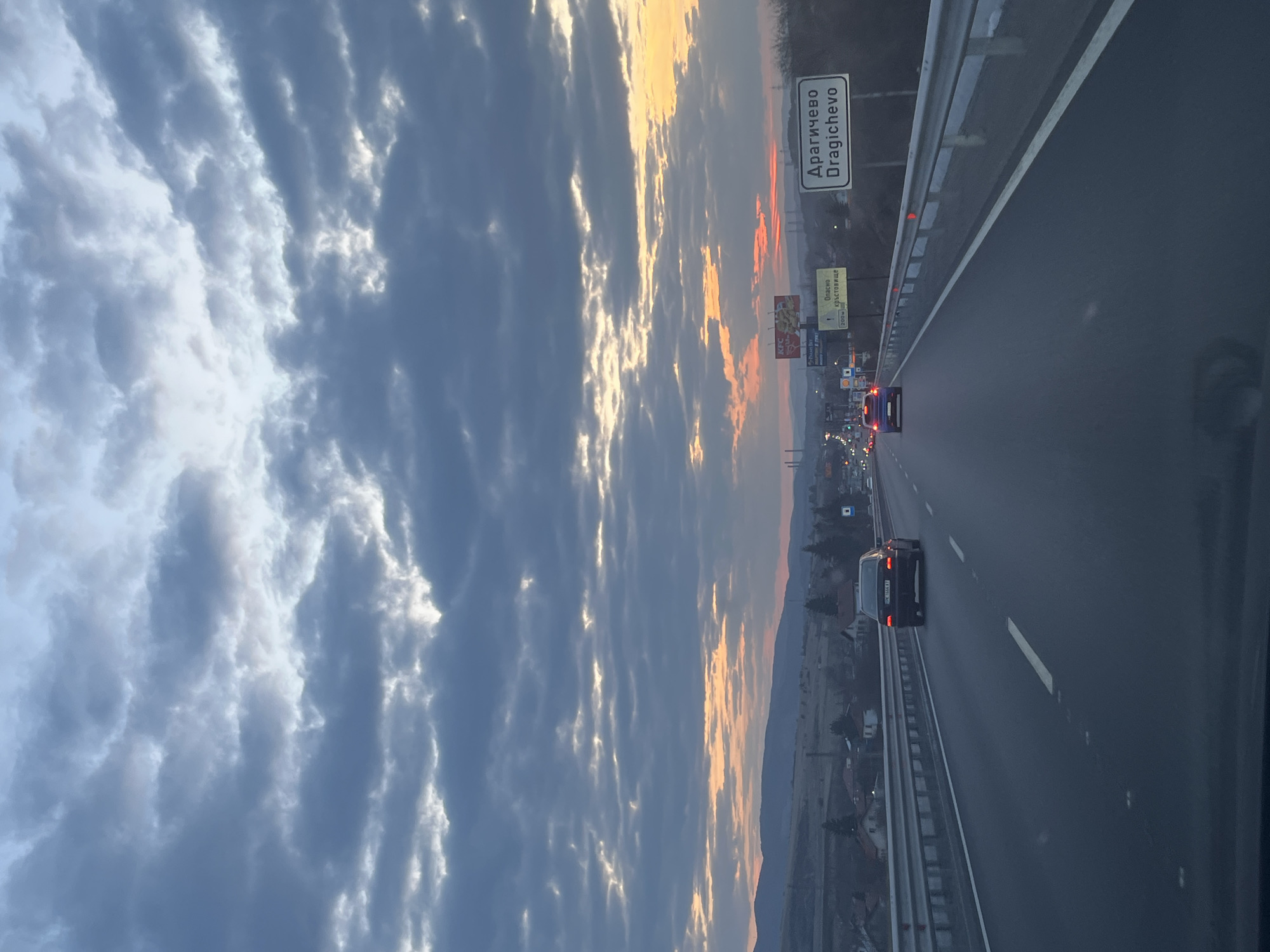 The image depicts a multi-lane asphalt highway scene at dusk or dawn, viewed from within a moving vehicle, likely in Dragichevo, Bulgaria