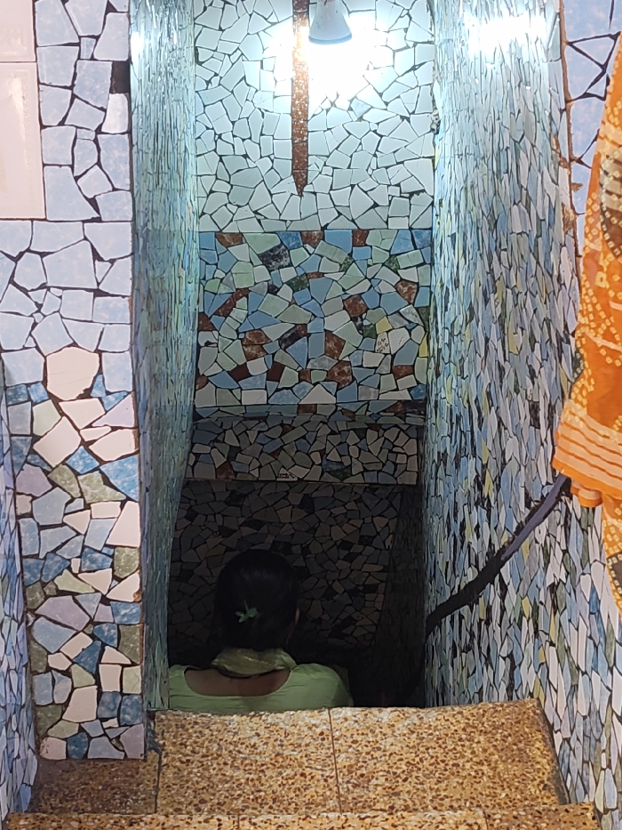An overhead-view photograph depicts a single individual descending a tiled interior staircase in Veraval, India. The subject, viewed from behind, has dark hair secured with a light green accessory and wears a light green garment. The staircase consists of light brown speckled treads. The surrounding walls are entirely covered in mosaic tiling composed of irregular ceramic fragments; the upper sections feature primarily light blue and white tiles, transitioning to a mix of light blue, white, brown, and green tiles further down the stairwell. An exposed light bulb fixture at the top provides overhead illumination, causing the lower sections of the stairwell to appear progressively darker. A dark handrail is affixed to the right wall. A section of orange and white patterned fabric is visible on the far right edge of the frame.