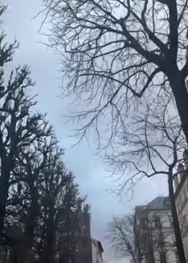 The video presents a street view in what appears to be an urban environment, likely in Europe, judging by the architecture. The sky is overcast and light grey. Bare trees line both sides of the street, their intricate branches creating a dark silhouette against the sky. Buildings of varying heights are visible, typical of European cities. The street is relatively empty, with faint hints of what might be vehicles or traffic signals in the distance. The video focuses on the contrast between the dark trees and the overcast sky.