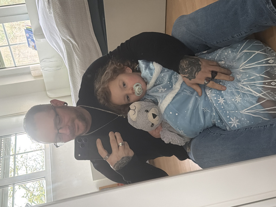 An adult male and a young child are depicted in a mirror selfie taken indoors within a residential setting. The adult male, with short dark hair, eyeglasses, ear gauges, and visible tattoos on his arms, wears a black long-sleeved shirt, blue jeans, a silver chain, and multiple rings. He is seated on a light-colored wooden floor, holding a dark-colored smartphone in his right hand to capture the reflection. A young child with curly light brown hair sits on his lap, wearing a light blue dress with white trim and snowflake patterns, resembling a costume. The child holds a small grey plush bear and has a pacifier in her mouth. Both individuals are looking directly into the mirror. In the background, a large window reveals outdoor foliage, suggesting daytime. A white bed frame or headboard with a white duvet is partially visible to the right. The specific location in Trassem, Germany, is not discernible from the visual content of the image.