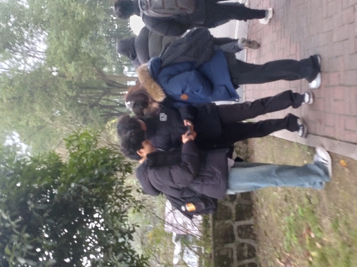 A group of people stand closely together on a brick walkway. Some wear dark jackets, while one person is in blue jeans. Trees and greenery border the walkway. The setting appears to be outdoors, possibly a park or campus. The photo captures a casual moment with people clustered in what might be a conversation or gathering.
