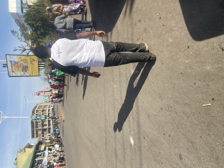 The image depicts a sunlit urban street scene on Murtala Mohammed Way, near the Terminus Market area, in Jos, Plateau State, Nigeria. In the foreground, a male subject, viewed from the back, walks away from the camera. He wears a white t-shirt with black sleeves, displaying "PERFECT" and a logo on the back, and dark trousers. His elongated shadow stretches diagonally left across the asphalt pavement, which has minor debris including a small bone-like object. To the left, a bustling commercial strip features pedestrians, parked vehicles, a two-story building with a green roof and visible scaffolding, and a multi-story concrete structure under construction. Modern streetlights with LED fixtures line a central median. To the right, a group of pedestrians, predominantly women in various casual and patterned attire, walk along a sidewalk parallel to the street. In the background, a large billboard with advertisements featuring consumer products is visible, along with additional buildings, vehicles, and distant pedestrians under a clear blue sky. The scene shows active pedestrian and vehicular movement on a clear, bright day.
