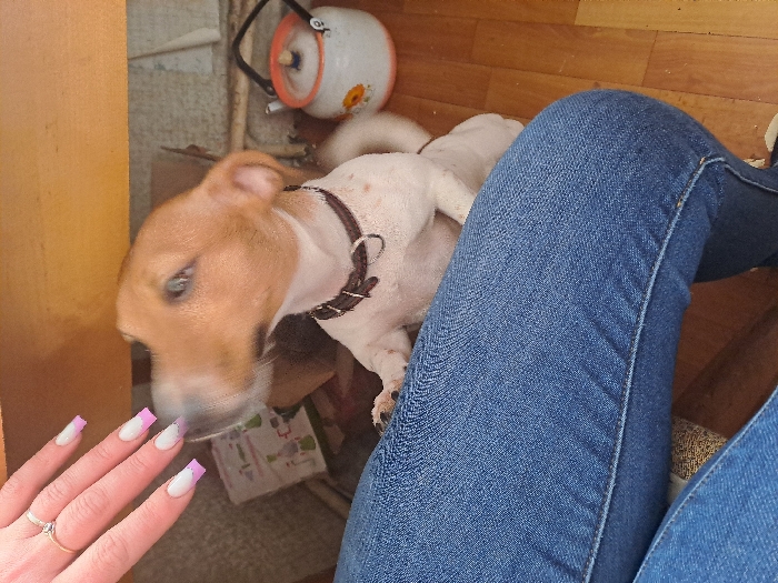 The scene is an indoor environment in the city of Bolshaya Elhovka, Russia, featuring a partial view of a person and a dog. A human left hand, displaying a ring with a clear stone on the ring finger and nails with a pink-tipped French manicure, is positioned in the upper left quadrant. Below the hand and extending across the lower left and central frame is a portion of a human leg clad in blue denim jeans. A small, short-haired dog, predominantly white with light brown markings on its head and ears, is standing on its hind legs to the right, wearing a dark brown collar with a silver-colored D-ring. The dog's head is turned toward the human hand, indicating an interaction, possibly sniffing. Its facial features are slightly blurred, suggesting motion. The background features a light-colored wooden floor and indistinct items. To the right of the dog, on the floor, an off-white enamel kettle with an orange lid and a faint floral pattern is visible. An overhead wooden surface, likely a table or desk, is partially visible above the dog's head.