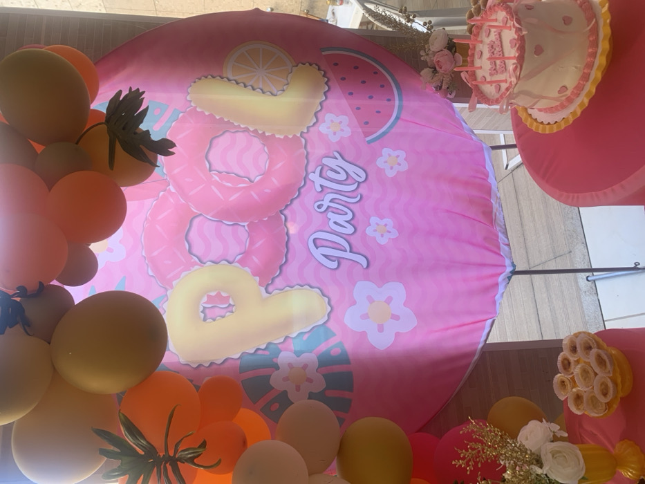 This image depicts a party setup in Camaçari, Brazil. The central element is a large, circular pink fabric backdrop featuring the text "POOL Party." The word "POOL" is rendered in stylized yellow letters resembling inflatable pool floats, while "Party" is in white script. The backdrop includes illustrations of light blue wavy lines, white and yellow flowers, a green and pink watermelon slice, and a yellow lemon slice. An arch of orange, yellow, and white balloons, adorned with artificial green leaves, frames the top and left side of the backdrop. In the foreground, to the left, a yellow vase contains white and gold-toned artificial floral arrangements on a pink surface. Adjacent to the vase, a yellow tiered stand holds approximately twelve small, golden-brown pastries in white paper cups. To the right, on a separate round table draped with a pink tablecloth, sits a white and pink two-tier birthday cake. The cake features pink frosting details, small pink hearts, and eight lit pink candles. The floor is composed of light-colored stone or tile. No individuals are visible.