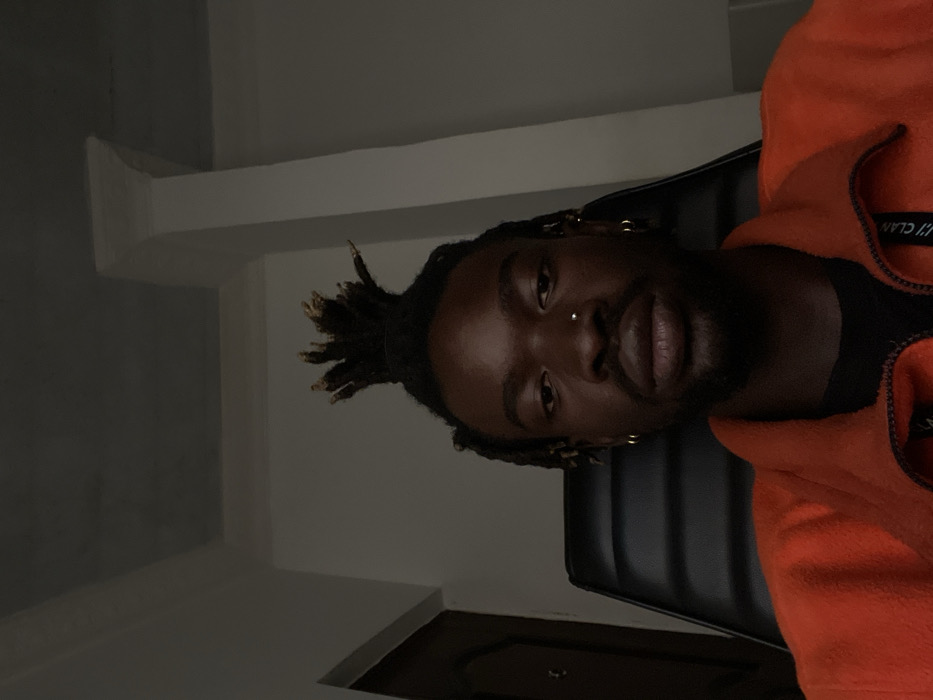 An individual is depicted seated indoors. The specific location in Narayi, Nigeria, cannot be confirmed from the visual evidence. The subject is a male with dark skin, dark dreadlocks styled into an upward bun with shorter braids on the sides, a light beard, a silver stud piercing in his left nostril, and two gold-colored hoop earrings in each ear. He wears an orange fleece jacket with a zipper. He occupies a black, high-backed office chair. The background consists of a dark brown door to the left, partially obscured, and a plain white or off-white wall to the right, featuring a vertical structural pillar. The ceiling is white with a darker central panel. The scene is dimly lit. The individual faces forward, directly towards the camera, with a neutral expression. No active interactions with other subjects or objects are apparent beyond sitting.