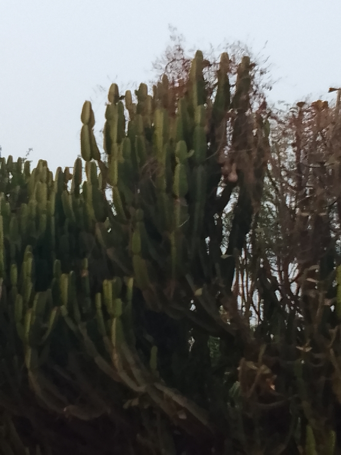 The scene depicts an outdoor environment in Barakin, Nigeria, under an overcast or light grey sky. A dense formation of tall, green columnar cacti occupies the majority of the frame, characterized by their vertical, segmented branches. Behind and to the right of the cacti, a deciduous tree with dark, bare branches is present. A light-colored, irregularly shaped object, consistent with a bird's nest or entangled debris, is suspended within the upper branches of this skeletal tree. The lighting is soft and uniform. No human subjects, animals (other than the potential nest), or prominent man-made structures are visible.