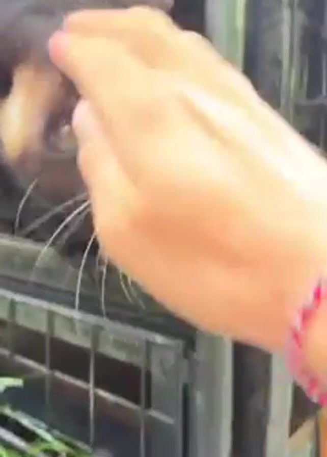 person interacting with a Binturong in an enclosure. The Binturong is a small, dark animal with prominent white whiskers. The person pets and interacts with the animal through the bars of the enclosure. A second Binturong is visible in the background. The enclosure is made of metal bars and contains some vegetation. The person is wearing a bracelet on their left wrist.