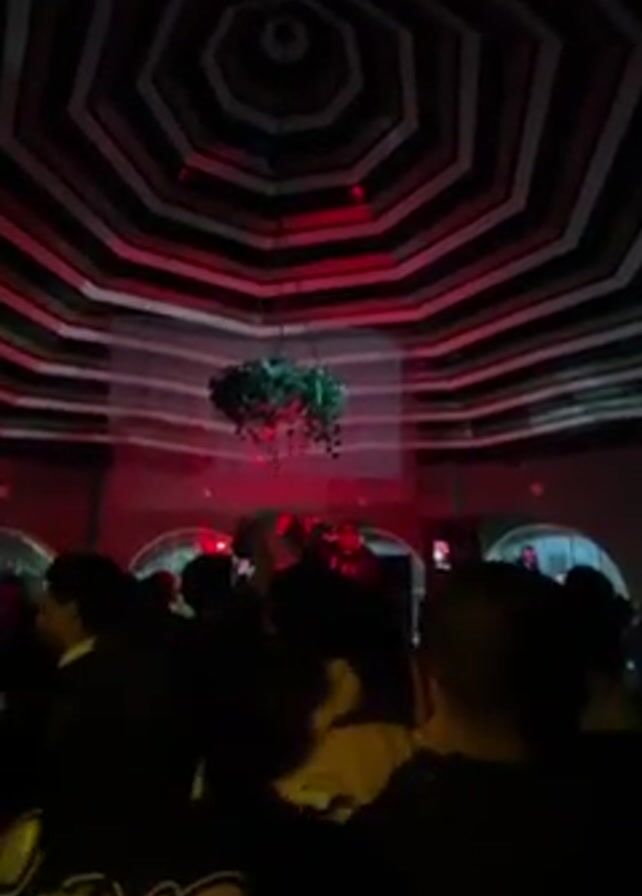A dark indoor space with a striped ceiling. A hanging plant basket is illuminated by red lights. Silhouetted people are in the foreground, some holding up phones. The lighting is dim, with a red hue. Some people are waving their arms.