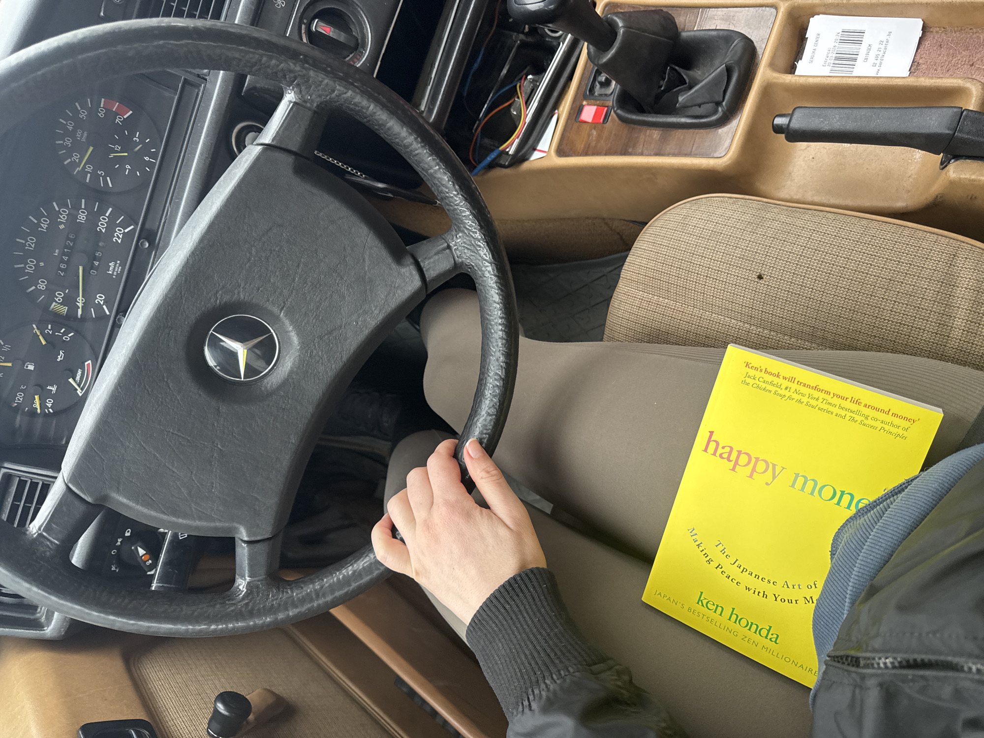 interior of an older model Mercedes-Benz vehicle, observed from the driver's perspective. A light-skinned hand, wearing a dark jacket with a ribbed cuff, rests on the worn black steering wheel, which displays the Mercedes-Benz star emblem. The dashboard's instrument cluster, partially visible behind the steering wheel, indicates an odometer reading of 264126 kilometers and includes an "ECONOMY" gauge. The car's interior features brown/tan door panels and a matching center console with wood-grain trim. Exposed red, blue, and yellow electrical wires are visible beneath a panel to the right of the steering column, and a manual transmission gear shifter is present. On the driver's lap, clad in light brown trousers, lies a bright yellow book titled "happy money" by Ken Honda, subtitled "The Japanese Art of Making Peace with Your Money." A white paper ticket is tucked into a compartment near the parking brake lever. The ticket is from "SERDIKA CENTER," indicating an entrance time of "20.03.2016 20:24" and listing "www.serdikacenter.bg". This identifies the location as Serdika Center, a shopping mall situated in Sofia, Bulgaria.