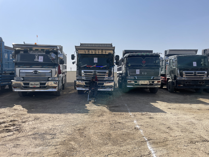 The image displays an outdoor scene in Pir Dust, Afghanistan, featuring a row of five large dump trucks parked on a dry, unpaved, light brown dirt lot under a clear, cloudless blue sky