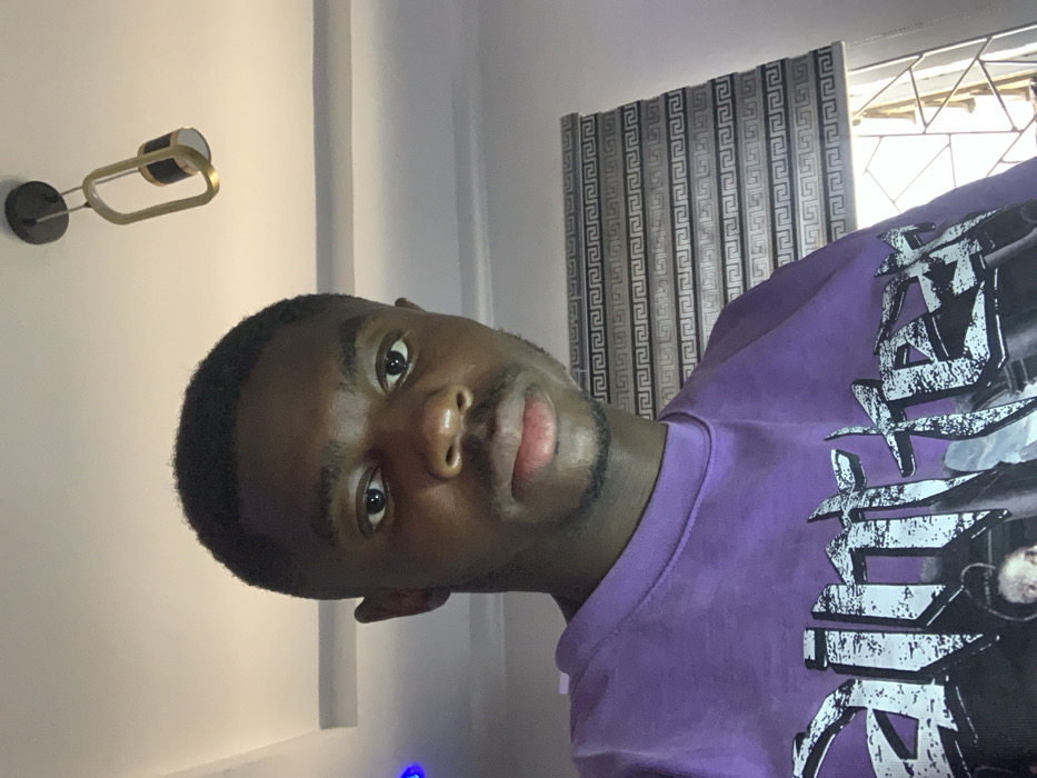 The image depicts a head-and-shoulders portrait of a young adult male of African descent, centered in the frame, looking directly forward with a neutral expression. He has short, dark hair with a faded haircut, dark eyes, and a faint mustache and chin beard. He is wearing a long-sleeved purple garment, likely a t-shirt or sweatshirt, with a large, distressed white graphic design visible on the chest, including partial text that appears to read "Sint" or "Street" with additional imagery below. The subject is positioned indoors, in what appears to be a residential or commercial interior space. The background consists of a white ceiling with a multi-layered or pop-up design. In the upper left background, a faint blue light source is visible on the ceiling. Towards the upper right, a modern-style ceiling light fixture is present, featuring a black base, a gold-toned rectangular frame, and a cylindrical light housing. To the subject's right, a window is partially obscured by horizontal blinds featuring a repetitive Greek key or meander pattern in black and grey tones. The lighting is even, suggesting an artificial light source. The specific location within the city of Jos, Nigeria, cannot be determined from the visual evidence provided in the image.