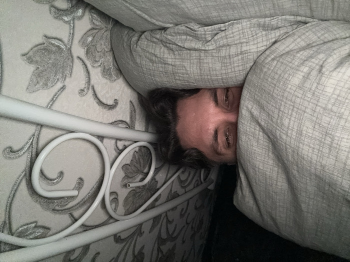 A person peers from beneath a gray blanket. The individual's eyes and part of their forehead are visible. Hair peeks out from under the blanket. Beside the person, a white metal bed frame with a decorative swirl design is positioned against a patterned wallpaper featuring floral motifs in shades of gray and white. The scene is lit dimly.
