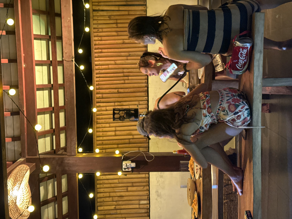 The image depicts a nighttime social gathering at an outdoor or semi-outdoor venue in Munggu, Indonesia