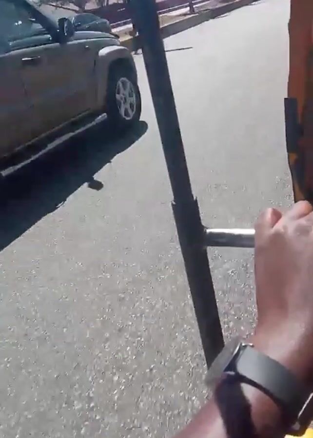 first-person perspective from inside what appears to be a three-wheeled vehicle, possibly an auto rickshaw or tuk-tuk, moving along a paved road. The driver's hand, wrist, and a smart watch are visible on the right side of the frame. A dark gray SUV with a spare tire mounted on the back is moving in the same direction on the left. Palm trees line the side of the road. The weather appears sunny.
