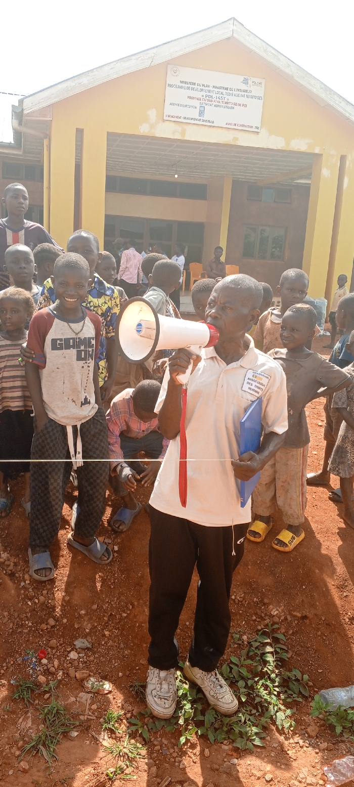 An outdoor scene in Kundu 1, Democratic Republic of the Congo, depicts a gathering in front of an administrative building. The building, constructed in 2023, features yellow exterior walls with brown trim, a light-colored roof, and a visible gutter. A sign on its facade identifies it as a "MINISTERE DU PLAN - MINISTERE DE L'INTERIEUR" administrative building for the "PROGRAMME DE DEVELOPPEMENT LOCAL 145 TERRITOIRES" in "PROVINCE DU SUD-KIVU," funded by the "GOUVERNEMENT CONGOLAIS" with UNDP as the executing agency. In the foreground, a dark-skinned elderly male, wearing a white short-sleeved polo shirt, black trousers, and white athletic shoes, stands addressing a group. He holds a white megaphone with a blue center and red rim to his mouth with his right hand, and a blue folder in his left hand. A red lanyard is visible around his neck. A white identification badge pinned to his shirt displays "GRADCPAX" and "ASSOCIATION DES DROITS HUMAINS." He is positioned slightly off-center to the right. Numerous children of varying ages, predominantly boys, are gathered around and behind the speaking male. One boy in a white t-shirt with a "GAME ON" graphic and dark checkered pants stands prominently to the speaker's left, smiling towards the camera. Other children wear various casual attire including t-shirts and shirts, some with patterned designs. Footwear includes sandals and flip-flops. Several adults are visible in the background near the building's entrance, some seated on orange plastic chairs. The ground is reddish-brown, dry, and unpaved, consisting of soil mixed with small stones and sparse green vegetation. The scene is illuminated by natural daylight.