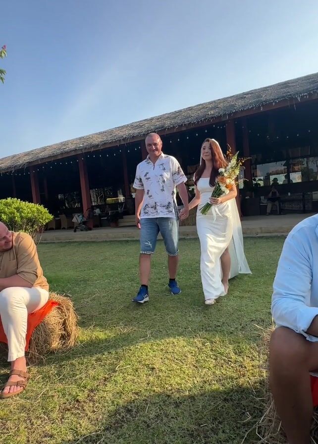 wedding procession outdoors on a sunny day. A woman in a white satin dress with a long veil and a bouquet of flowers is walking hand-in-hand with a man in a patterned shirt and shorts. They are walking across a grassy lawn towards a building with a thatched roof. Several people are seated on hay bales on either side of the path, watching them. The scene appears to be a relaxed and informal wedding celebration. String lights are visible in the background.