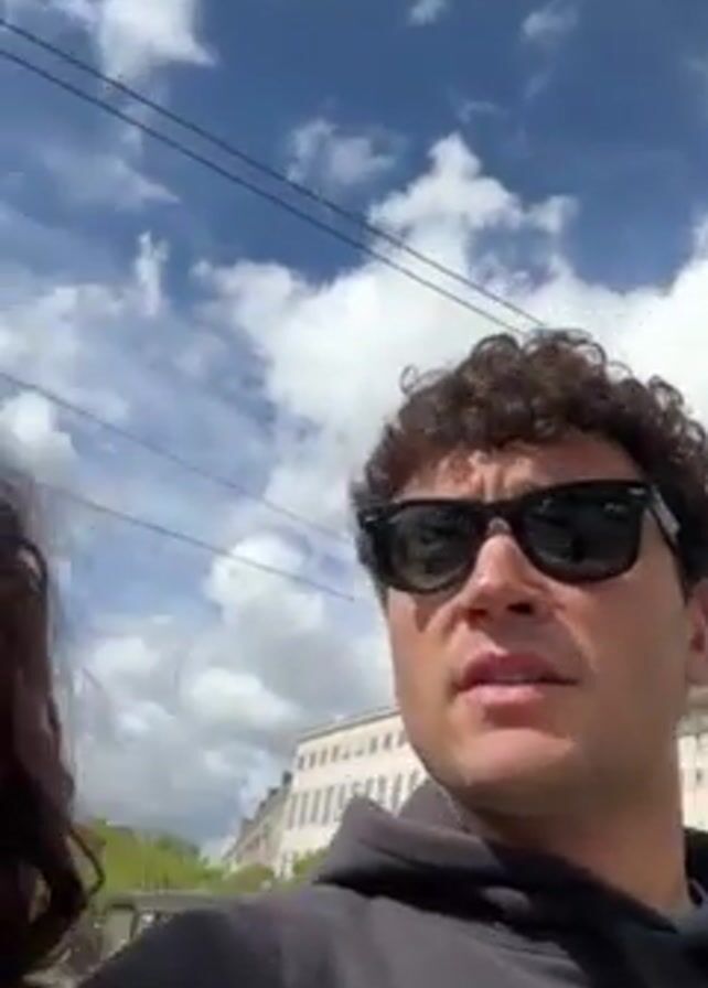 A man with curly hair and sunglasses is recording a video of himself with his phone on a city street