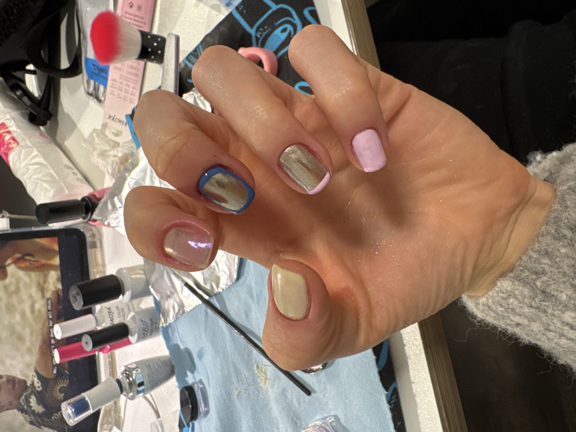 - "A close-up, elevated view captures a person's left hand in an indoor setting in Hull, United Kingdom, actively displaying newly adorned fingernails against a backdrop of nail art supplies on a light-colored table" by FM-Gswv13, licensed under CC BY 4.0