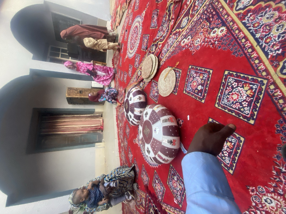 A red patterned carpet serves as the ground for a gathering. Two round pillows, decorated with brown and white patterns, sit in the foreground next to woven straw items. People are seated and standing nearby. One person holds a baby on the left, while others wear traditional garments. An open door and a window are seen in the background against a light-colored wall. The hand of a person wearing a light blue garment is in the foreground.