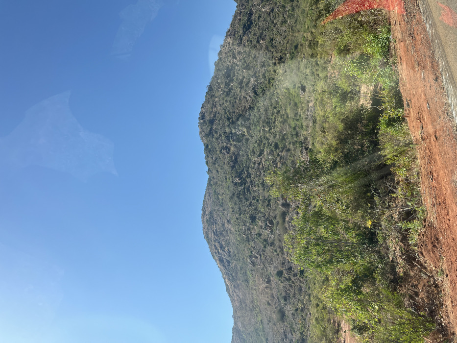 The image depicts a natural landscape in Dorowa, Nigeria, under a clear, bright blue sky. A large, rocky hill or mountain occupies the middle and background, its slopes covered with a mixture of sparse green vegetation, dry brown shrubbery, and exposed greyish-brown rock formations. The foreground consists of reddish-brown earth, possibly a dirt road or embankment, along which a dense band of green trees and shrubs is growing. No individuals, animals, or man-made structures are visible. Faint reflections are present in the upper sky region, indicating the photograph was taken through a transparent barrier.