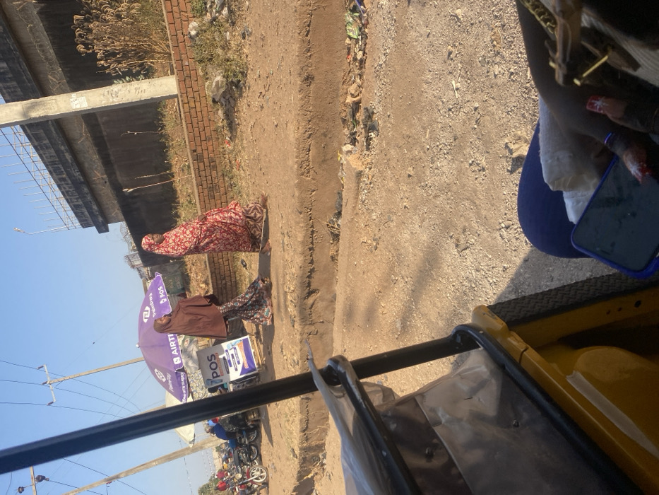 The image depicts a daytime street scene in Kaduna South, Nigeria, viewed from inside a yellow tricycle. In the foreground, the lower right section of a yellow tricycle with a black support bar and tire is visible, along with the lap of an individual wearing blue attire, holding a smartphone with a dark blue case, and a white bundled item and a red-capped object. The midground features an unpaved, light brown dirt road with a prominent, shallow drainage ditch running along its length. Two women are walking from right to left on the far side of this ditch. The woman closer to the viewer wears a brown head covering and a patterned dress, while the woman further away is clad in a red and white patterned full-body garment. Behind them, a purple umbrella branded "AIRTEL" shades a white "POS" (Point of Sale) stand with blue text. Several motorcycles are parked to the left of the stand, with additional people visible in the distance. The background shows a tall concrete utility pole, a low brick wall, and an elevated, arid patch of ground with sparse, dry vegetation. Beyond the wall, a large, dark building with a security fence on its roofline is present. Overhead, a clear, light blue sky with utility lines completes the scene.