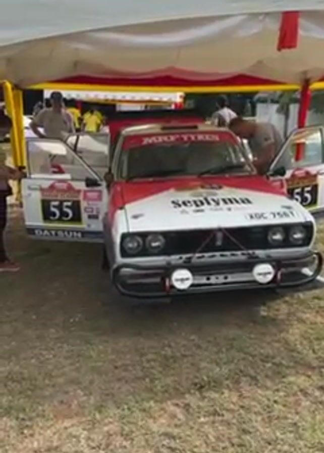 A static shot shows a red-and-white Datsun rally car, number 55, under a white tent with red and yellow trim