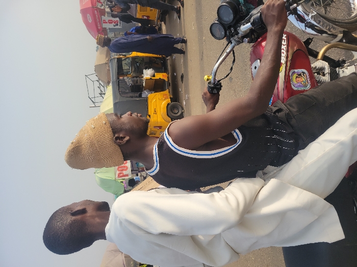 The image captures a daylight street scene in Sabojibi, Nigeria, presenting a bustling urban environment. In the foreground, two male individuals are seated on a red Bajaj Boxer motorcycle on a paved road. The driver, with a dark complexion, wears a black sleeveless shirt with blue and white trim and a light brown, conical knitted hat. He grips the motorcycle handlebars, his gaze directed towards the right side of the frame. Behind him, a passenger, also with a dark complexion, wears a white long-sleeved traditional tunic and white trousers. This passenger is positioned facing away from the camera, looking towards the left side of the frame. The motorcycle's fuel tank features a decorative sticker. The background reveals a lively area with several yellow auto-rickshaws (Keke Napeps), various market stalls or temporary structures with open umbrellas (green, red, brown), and several pedestrians. Two distinct signs displaying "POS" (Point of Sale) are visible under different colored umbrellas, indicating commercial activity.