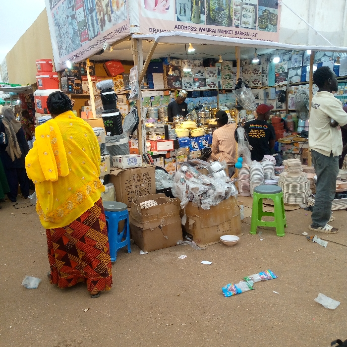 A bustling outdoor market scene features a vendor stall laden with various goods, including kitchenware and appliances. Customers browse, some seated on stools. A woman in a bright yellow shawl and patterned skirt stands facing away from the viewer. Cardboard boxes overflow with merchandise on the ground. Trash litters the bare dirt surface. The stall's sign indicates the location as "WAMBAI MARKET BABBAN LAYI."