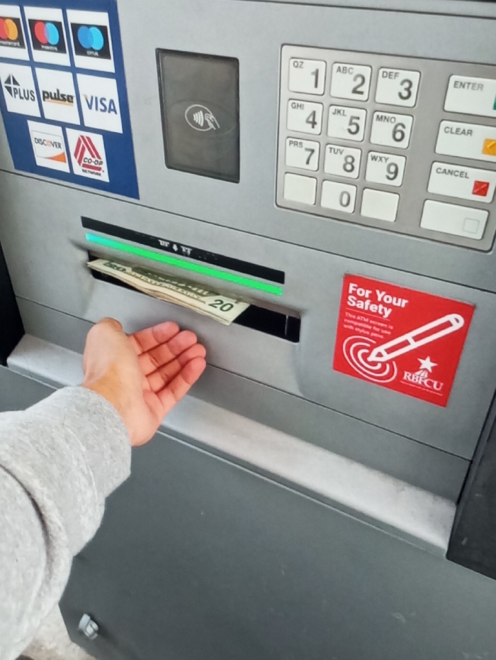 - "A close-up, first-person perspective image depicts a human hand reaching into the cash dispenser slot of a gray automated teller machine (ATM)" by FM-a9LKm1, licensed under CC BY 4.0