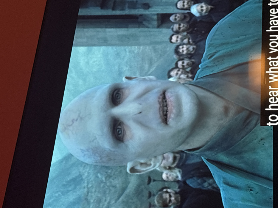 A close-up, tilted shot shows Voldemort, from the "Harry Potter" series, with a pale face, no nose, and narrow eyes. Behind him, a line of Death Eaters is visible. A blurred, vertical caption on the right reads "to hear what you have to". The image is framed by a black border, likely a TV screen, with a hint of orange wall on the left.