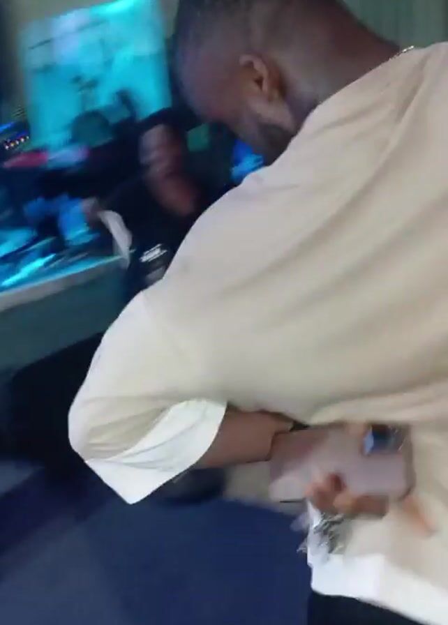 A man with dark skin, a bald head, and a short beard dances enthusiastically in what appears to be an indoor gathering or event. He is wearing a light brown t-shirt and a silver chain. He sweats as he dances. In the background, other people, including a child, are visible. A blue rope is used as a barrier. Stage lighting is visible in the background.