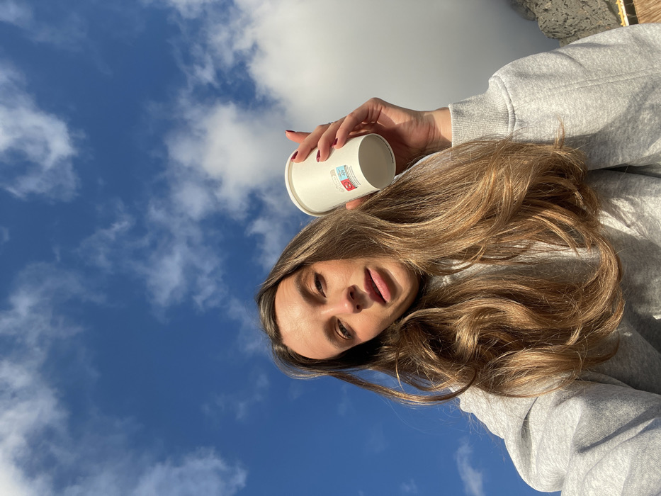 A single female individual is depicted in an outdoor setting in Drobnići, Montenegro. The subject, viewed from a low angle, has long, wavy light brown hair and is wearing a plain grey hooded sweatshirt. Her right hand, featuring dark red nail polish, holds a white disposable cup with small, partially discernible labels on its side. Her head is slightly tilted, and her eyes are directed towards the camera. The background consists of a bright blue sky with scattered white cumulus clouds. A dark, irregular mass, possibly rocky terrain, is visible in the lower right corner of the frame. The scene is illuminated by natural sunlight.