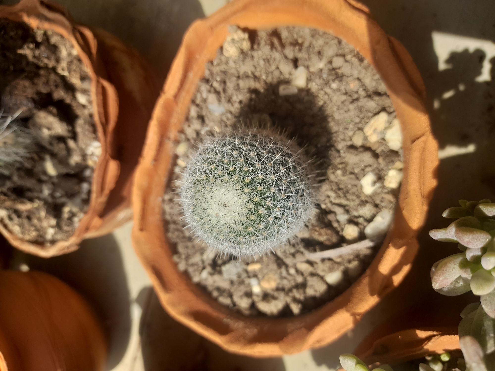 top-down view of a small, round cactus in a textured, terracotta pot. The cactus is covered in white spines. The pot is filled with a light brown, gravelly soil. A portion of another terracotta pot is visible to the left, and a succulent plant is partially visible on the lower right. The setting appears to be outdoors under natural light. The city of Tinaquillo, Venezuela is not evident in the image.
