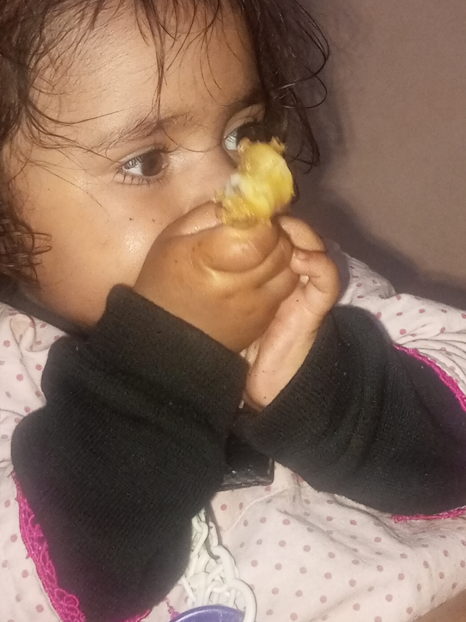 A young child with wet, dark hair is holding a piece of fried food, possibly chicken or fish, in front of their mouth. The child is wearing a black sweater with pink trim over a white, polka-dotted shirt or blanket. The background is a neutral, solid color. There is no indication of the location being Mansehra, Pakistan.