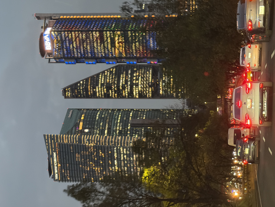 Skyscrapers dominate the left side, illuminated with bright office lights against a dim, overcast sky. Building signage includes BBVA, Deloitte, and The Ritz-Carlton. On the right side, a line of vehicles, predominantly white sedans, are visible with their red taillights glowing, suggesting evening or nighttime conditions. Trees line the street between the buildings and the traffic.