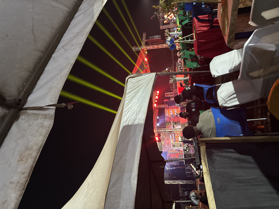 An outdoor event viewed from inside a tent. Stage lights shine in yellow laser beams through the dark sky. A large stage with video screens and speakers is set up. People are watching the show, seated in rows of white and blue chairs. The tent's white fabric is visible on the left side of the frame.