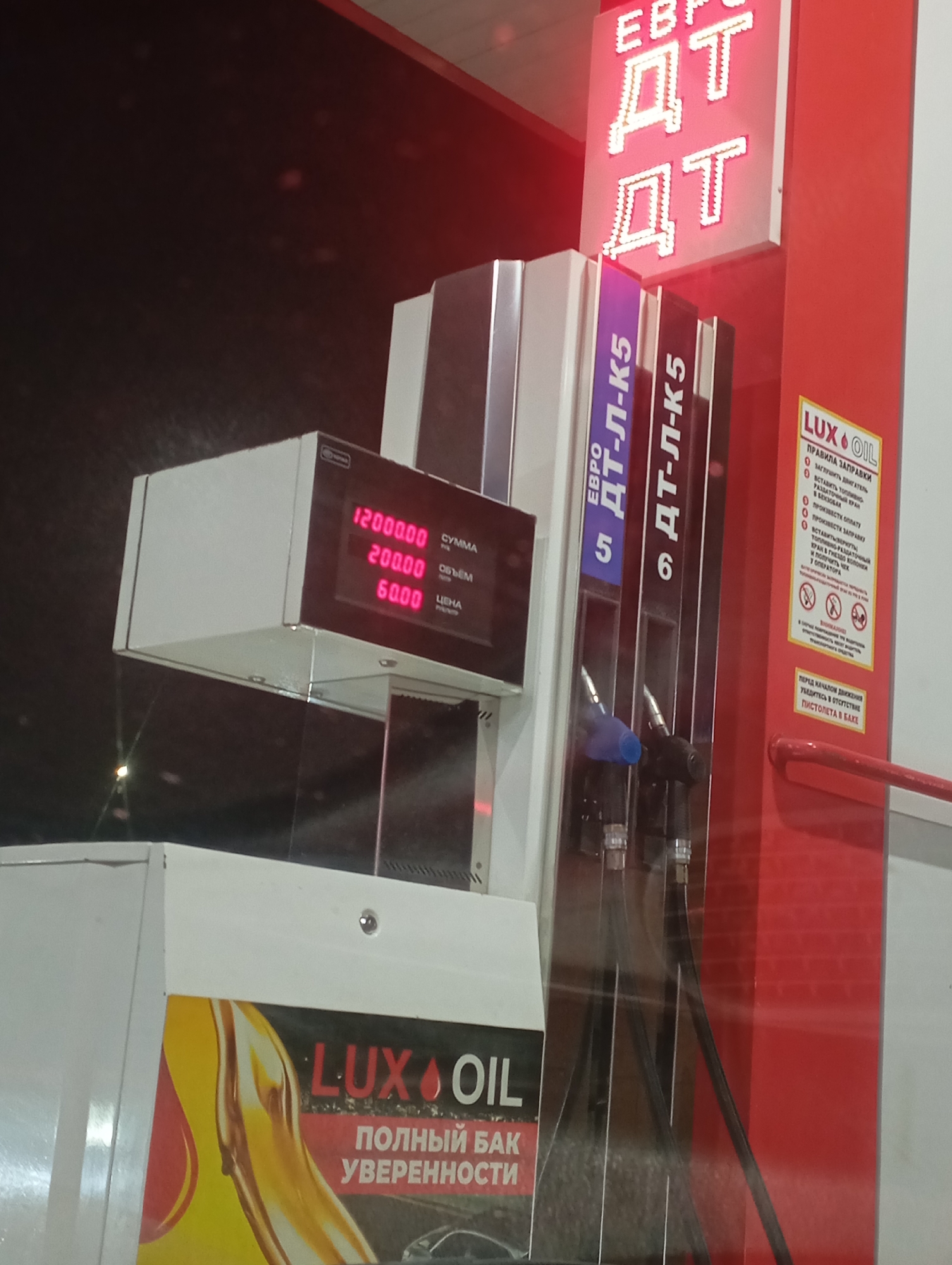 gas station, likely in Enem, Russia, based on the Cyrillic lettering. The gas pump displays "EURO DT-L-K5" and "DT-L-K5" for the fuel types on pump 5 and 6 respectively. The pump's display shows "12000.00," "200.00" and "60.00" for "SUMMA" (amount), "OBYEM" (volume), and "TSENA" (price). A "LUXOIL" advertisement is affixed to the pump. A sign provides refueling instructions in Russian. The environment appears to be dimly lit, suggesting it may be nighttime.